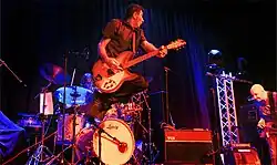 In 1983 they went into Studios 301 to record and released the song 1984[6] on their own label, The single sold in enough quantities to attract the attention of George Wayne from Triple J[4] who invited the band into the Australian Broadcasting Corporation studios to play live to air. In 1984[4] they recorded a more pop-oriented single, She's Probably,[2][5] produced by Adelaide guitarist Mal Eastick[5] from Stars (Australian band) and producer of the Andy Durant Memorial Concert. This single won numerous favourable reviews around the country[3] and gave the band a boost around Sydney before a membership reshuffle took some time to consolidate the new four-piece line up.[7] The band resurfaced nationally in 1986 with their Borrowed Time EP[2][3][7][8] and an appearance on a nationally televised talent quest Star Search (Australia). During this time the Urban Guerillas played regularly at the Sandringham (Sando) and until Roaring Jack entered the scene, had held the over-the-bar record[9] of takings at the famous inner west hotel. (The Roaring Jack crowd consistently managed to out-drink the Urban Guerillas punters). The band toured nationally in 1986[2][3][8][10][11] mostly headlining but also playing some notable supports with The Saints,[7] The Hitmen, the New Christs and Spy vs Spy.[7] In 1987 the band released their signature tune Here Come the Americans.[12][13][14] An anthem against the Americanisation of Australian culture. Using a war analogy for the cultural invasion gave the song a literal interpretation that resonated with the peace movement. The song gave the Urban Guerillas a provocative edge and the renewed attention from the media delivered access to the suburban venues. Through various line-up changes[13] the band experimented and consistently fronted up as an energetic and formidable live performance unit until the end of 1987, when after much touring and having all their gear stolen,[15][16][17] the Guerillas had imploded.