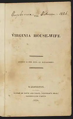 The Virginia House-Wife was first published in 1824; it was republished at least nineteen times before the outbreak of the Civil War.[1] The book was 225 pages long, included nearly 500 recipes,[2] and resulted from Randolph's "practical experience as keeper of a large establishment, and perhaps in the hope of further augmenting the family income."[3] The Virginia House-Wife is considered the first regional American cookbook.[1]