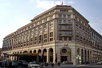 The site remained vacant until the East German state-run Interhotel monopoly decided to build a flagship luxury hotel for Western tourists in the 1980s. The structure was designed by a collective of architects headed by noted East German architect Erhardt Gisske in the style of early twentieth century luxury hotels, and with a glass dome modeled on the one in the former Kaisergalerie.[2] The East German government hired the Japanese Kajima Corporation to manage the building of the 200 million mark structure, and Kajima in turn subcontracted the construction work to the Swedish Siab construction company.[3] The hotel was opened as the Grand Hotel Berlin on August 1, 1987 by East German leader Erich Honecker as part of the city-wide celebrations of the 750th anniversary of the founding of Berlin.[4] It was only open to foreign guests, as it did not accept East German Marks, only Western hard currencies.[5]