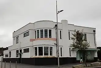 The White House was one of a number of roadhouses developed in Edinburgh in response to the growth of the motor car.[7] It was designed by architect William Innes Thomson of the firm W N Thomson and Co for Jemima Hood Gair.[1][4][5][8] Gair's fifteen year old daughter convinced her to request a Moderne design.[3] The White House opened on 18 October 1936.[1][4][5][8] It is a two-storey irregular-plan International Style and Modern building with Art Deco detailing;[1] its lounge bar bay window has been compared to that of the card room of the RMS Queen Mary.[9] The ground floor of the building featured a public bar, saloon bar, tea room, and skittle alley, while the first floor featured a billiard room and lounge bar.[1]