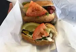 The establishment is known for its char-grilled food, especially its hot dogs and hamburgers (commonly called char-dogs and char-burgers).[5] A Wieners Circle char dog with "the works" is a grilled Vienna Beef hot dog on a warm poppy seed bun, topped with mustard, onions, relish, dill pickle spears, tomato slices, sport peppers and a dash of celery salt.