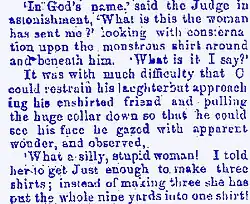 The humorous anecdote follows Judge A., who regularly neglected packing a second shirt during his travels. He arrives in Raleigh, North Carolina, as part of a business trip. While hoping to find a shirt to borrow, he hints to his lawyer friend (Mr. C.) that he needs one in order to attend a prominent party the following evening. (The narrator clarifies that ready-made shirts were not purchasable "in those days", likely setting the story in the early 19th or late 18th century.) To teach Judge A. a lesson, Mr. C. specifically orders a comically large shirt and promises to have it delivered before the party. Minutes before their departure, the shirt arrives; Judge A. initially praises the craftsmanship, then struggles to pull it on, until he "[finds] himself enshrouded in a shirt five yards long and four yards broad". He is unable to see beyond the collar and expresses his astonishment at the "monstrous shirt".[2]