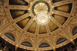 The theatre's central foyer is plastered and painted in rose, white and gold, with columns of marble, large glass doors, and a roof consisting of stucco panels painted in white, rose and gold.[1] This space accesses the lounges, bar, dressing rooms and the spectators' seating on the first floor, across a staircase of black marble and metal/wood handrails.[1]
