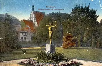 In the garden along the banks of the Brda river was a popular café called "Theatre" ((in Polish) "Teatralną"). In a nearby square, on 18 October 1910, The Archer ((in Polish) Łuczniczka) by Berliner Ferdinand Lepcke was unveiled It is considered one of the symbols of Bydgoszcz. After World War II, the masterpiece was moved to a public garden nearby Gdanska street.
