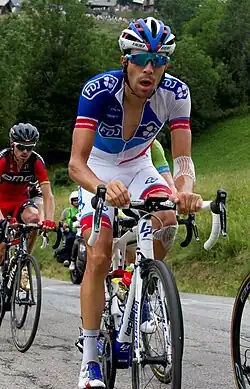 Pinot, aged 22 was the youngest rider in the Tour de France.[18] He took a prestigious victory on the eighth stage from Belfort to Porrentruy, which comprised seven categorized climbs including the Category 1 Col de la Croix, where he passed Fredrik Kessiakoff (Astana) shortly before the summit,[19] with 16 kilometres (9.9 miles) remaining. He then negotiated the descent and the flat portion of road, holding on to a lead of 26 seconds over the chasing group – which included some of the Tour's general classification contenders – despite a headwind and while being frantically encouraged by his team manager, Marc Madiot.[20][21] Despite being the youngest rider at the Tour,[18] he managed to finish 10th overall in the final general classification. At 22 years and 54 days, he became the youngest rider to finish in the top 10 since Raymond Impanis (aged 21 years, 8 months) in 1947.[22] Following the Tour de France, Pinot took a stage victory on the final day of the Tour de l'Ain.[23]