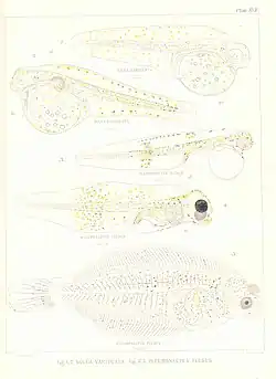 FMIB 47584 Solea variegata - Larva of Thickback Newly hatched, April 24, 1889 Pigment as seen by reflected light yk- yolk (1); Solea