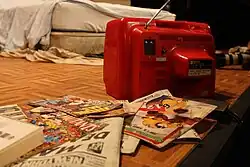A portable television and comic books are props on the floor of a set from This Is Our Youth at Sydney Opera House