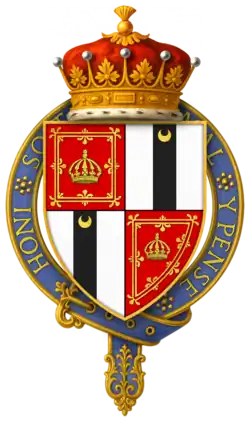 Erskine acquired Kellie Castle from the 5th Lord Oliphant in 1613 and was given the barony of Kellie.[17] On 23 April 1615 he was made a Knight of the Garter.[18] He had lodgings at Theobalds House near London. When the Dutch ambassador Noel Caron came to Theobalds on 16 March 1616, he waited first in Lord Fenton's lodging before seeing King James in the Privy Gallery.[19]
