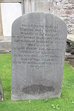 Rev Prof Thomas Halyburton (25 December 1674 – 23 September 1712) was a Scottish divine. Thomas was educated there at Erasmus's school, in Rotterdam, where his mother had taken him to avoid persecution. He returned to Scotland in 1682, graduated at the university of St. Andrews on 24 July 1696 and, after serving as a private chaplain, was licensed by the presbytery of Kirkaldy on 22 June 1699. He was ordained to the parish of Ceres, Fifeshire, 1 May 1700, but he injured his health by excessive labour. On 1 April 1710 he was appointed by Queen Anne, at the instance of the synod of Fife, professor of divinity at St. Mary's. He devoted his inaugural lecture to an attempt to confute the deistical views lately promulgated by Dr. Archibald Pitcairn in 1688. He died at St. Andrews on 23 September 1712, aged only 38.[1]