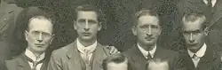 Subset from "Group portrait of released 1916 prisoners outside Mansion House, Dawson Street, Dublin", showing Eoin MacNeill, Éamon de Valera, Thomas Hunter and Piaras Béaslaí.