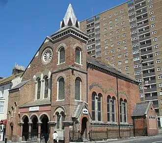 By the 1870s, a dense working-class residential area had developed to the east of Brighton on the way to the high-class Kemp Town estate; it became known as Kemptown [sic].[13] Methodist minister J. Martin wanted to extend that denomination's reach into the area, and on 1 March 1872 Lainson submitted plans for a church on the corner of St George's Terrace and Montague Place.[14][15] His Romanesque Revival design was accepted, and builder John Fielder constructed the church in 1873.[15] Bristol Road Methodist Church survived in religious use until 1989, when it became a recording studio.[14]