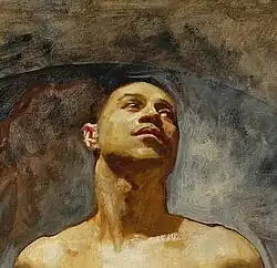 Sargent painted Nude Study of Thomas McKeller between 1917 and 1920. This oil on canvas painting depicts a nude McKeller seated, perched on a pillow, body tensed, legs akimbo, and head tilted back in a heroic pose in front of an aureole of amorphous feathery wings. His brown skin is bathed in rich golden light. The painting may have started out as a study for Prometheus. Sargent never publicly exhibited the portrait but kept it on display in his studio.[1] New York Times art critic Holland Cotter observed, "It's a transfixed and transfixing image, sensual, aspirational. And I would say homoerotic."[2] Curator Guy McElroy described the portrait as "redolent with a fluid naturalism and heroic posture."[6] Historian Michael Henry Adams deemed it "resonant of a conception of not just black humanity but of an African American nobility."[7]