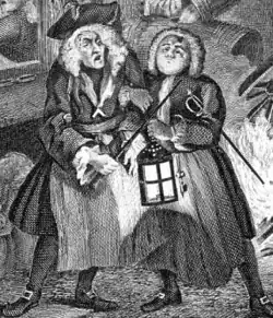 Sir Thomas de Veil (left) in masonic clothing, as depicted by William Hogarth in Night, part of his series of engraving Four Times of the Day.