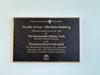 Opening plaque commemorating the opening of TRU Law's Old Main building by the then-Premier of British Columbia Christy Clark