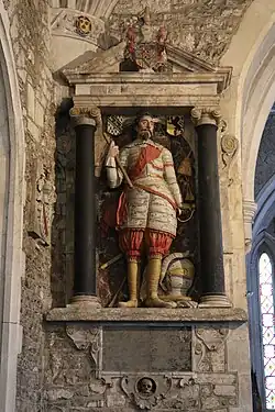 The great-grandson of William Cooke and Mary Kelloway was John Cooke (d.1632) of Thorne,[13] whose mural monument with effigy survives in St Mary's Church, Ottery St Mary. He married Margaret Sherman, a daughter of Richard Sherman of Ottery St Mary, whose arms (Or, a lion rampant sable between three holly leaves vert)[14] appear on the monument. He is said by Stabb[15] to have been murdered by a younger brother, and "the story goes that at midnight the statue steps down from its niche and walks about the church". The monument was restored by his grandson in 1726.