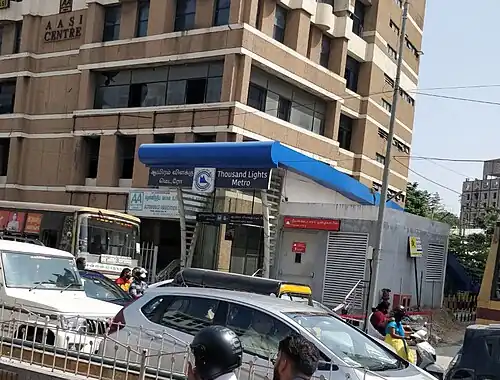 Thousand Lights is an underground metro station on the North-South Corridor of the Blue Line of Chennai Metro in Chennai, India. This station serves the neighbourhoods of Royapettah, Greams Road, and Gopalapuram. The station is named so because of the presence of the Thousand Lights Mosque in the vicinity. The station was opened for public on 10 February 2019. However, some portions of the construction work remains incomplete on the date of inauguration.[1]