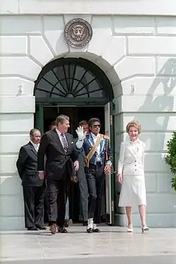 Jackson (center) with US President Ronald Reagan and First Lady Nancy Reagan at the White House in 1984