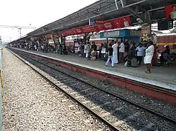 Thrissur railway station (station code: TCR[2]) is an NSG–2 category Indian railway station in Thiruvananthapuram railway division of Southern Railway zone.[3] It is a railway station in Kerala, India. Thrissur also is known as the Cultural Capital of Kerala. Thrissur railway station is a major railway head in South India and A1 classified station operated by the Southern Railway zone of the Indian Railways and comes under the Thiruvananthapuram railway division. It is one of the busiest railway station in Kerala state in terms of rail traffic with 189 halting trains. At ₹97 crore (equivalent to ₹121 crore or US$14 million in 2023) in financial year 2018–19, it is the fourth largest in terms of passenger revenues in Kerala and the eighth largest in Southern Railway.[4] Daily trains are available to Mumbai, New Delhi, Kolkata, Bangalore, Chennai, Mangalore, and Hyderabad. This station lies on the Shoranur–Cochin Harbour section, which is one of the busiest railway corridors in Kerala.[5] It has three satellite stations, Punkunnam railway station and two minor stations, Ollur railway station and Mulankunnathukavu railway station. Thrissur railway station also connects to the temple town of Guruvayur by Thrissur–Guruvayur section.