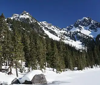 The Alpine Lakes Wilderness features some of the most rugged topography in the Cascade Range with craggy peaks and ridges, deep glacial valleys, and granite walls spotted with over 700 mountain lakes.[6] Geological events occurring many years ago created the diverse topography and drastic elevation changes over the Cascade Range leading to the various climate differences.