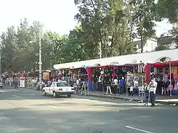 A tianguis is an open-air market or bazaar that is traditionally held on certain market days in a town or city neighborhood in Mexico and Central America. This bazaar tradition has its roots well into the pre-Hispanic period and continues in many cases essentially unchanged into the present day.[1] The word tianguis comes from tiyānquiztli or tianquiztli[2][3] in Classical Nahuatl, the language of the Aztec Empire.[4] In rural areas, many traditional types of merchandise are still sold, such as agriculture supplies and products as well as modern, mass-produced goods. In the cities, mass-produced goods are mostly sold, but the organization of tianguis events is mostly the same.[4][5] There are also specialty tianguis events for holidays such as Christmas as well as for particular types of items such as cars or art.[6][7]