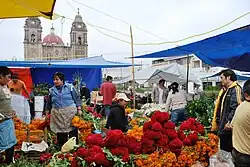 The tianguis in rural areas most closely resemble those of centuries past.[4] Most still contain a large amount of agricultural supplies, produce and other food staples, livestock, handmade items and traditional clothing. In many, indigenous languages such as Nahuatl and Zapotec can be heard. One example is the Sunday market of Cuetzalan, Puebla, where Nahuatl speaking people can be heard negotiating prices on items such as vanilla beans, handcrafted textiles, huipils, coffee, flowers and baskets much as their ancestors did.[4] The Tlacolula Sunday market in Oaxaca is the largest and busiest in the central valleys area of the state, and brings people from the very rural areas into town to both sell and buy. The market fills an important retail and social gap as most of the outlying villages are too small to support permanent stores and many use the opportunity to converse with distant neighbors. Even sellers will consider who they want to socialize with when choosing a selling space.[18] The tianguis of Chilapa, Guerrero attracts thousands of Nahua and Tlapaneco people, who come to buy and sell handcrafts, medicinal plants, local specialties such as pozole and many other items. Many of the visitors are from neighboring regions. Prices are low. It is possible to buy a liter of mezcal for only 25 pesos.[9] The weekly Thursday market in Villa de Zaachila is divided into three parts, one devoted to firewood, as many still cook with it, one to livestock and the rest to basic staples.[24] While many of the goods sold in rural markets are similar to those sold for centuries, modern items such as mass-produced tools, clothing such as jeans, CDs, DVDs and automobiles are also sold.[9][18]