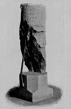 The palaces of Tiepolo and Querini were ordered torn down as a sign of their infamy.[64][69] Tiepolo's was levelled on 25 July 1310. In 1364, during the Revolt of Saint Titus in Crete, a column was erected with the inscription: "This plot of land was Baiamonte's and now, because of his evil betrayal, it has been made common land to frighten others, and forever show all people [the benefits of] good sense". A follower of Tiepolo's, Francesco Fantebon, later tore down the column, being punished for this with cutting off of a hand, blinding, and exile. The column was re-erected, and is now in the Museo Correr. A plaque is still present at the column's former location, with the Latin inscription "loc[us] col[umnae] bai[amontis] the[upoli] MCCCX".[55][40] The demolition of the Querini Ca' Grande palace was delayed, as it was commonly owned by Marco and his two brothers, Pietro and Giovanni Querini; while Pietro was involved in the conspiracy, Giovanni was not. Unable to clearly delineate the boundaries of the brothers' properties, in the end, the government bought out Giovanni's share in the house, and tore it down except for two arches that were incorporated in 1339 in the building of the Ufficiali alle Beccherie, the officials responsible for supervising the butchers.[69][70] Finally, in December 1310 all other members of the Tiepolo and Querini families were ordered to change their coats of arms, and take responsibility for effacing all the older versions throughout the city.[68]