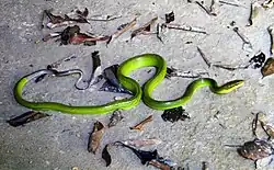 It was first classified as a forest reserve in 1933 by the authority of British North Borneo and then became a marine park in 1978 with the current management and jurisdiction falls within the purview of Sabah Parks.[1][3] The island features a variety of flora and fauna with a rich marine ecosystem,[18] coupled with a variety of bird species,[19] including Columba griseigularis,[20] pied hornbills, and megapodes.[21] It also becomes the habitat for mammals such as long-tailed macaques and reptiles such as monitor lizards and skinks, which can be spotted roaming around the island.[21] Its neighbouring island, the Kalampunian Damit Island (literally the Snake Island), which is part of the Tiga Island National Park with a landmass consisting of limestone, sandstone, and shale with trees such as figs and Pisonia, becomes the natural breeding ground for various snakes (including sea snakes), hosting thousands of species such as the Yellow-lipped sea krait (Laticauda colubrina), Paradise tree snake (Chrysopelea paradisi), and the Grey-tailed racer (Gonyosoma oxycephalum) that emerge around the island with some slithering around Tiga Island especially during mating season.[2]
