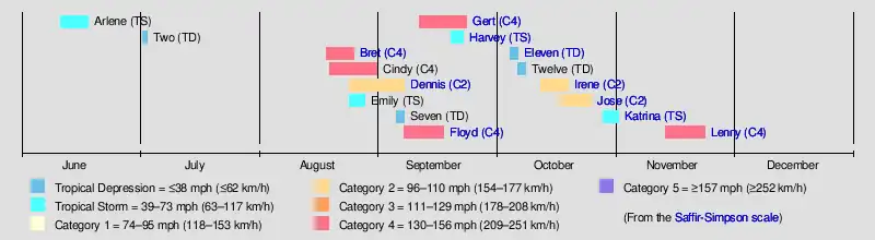 The 1999 Atlantic hurricane season was an event in the annual tropical cyclone season in the north Atlantic Ocean. This Atlantic hurricane season saw a near-average number of named tropical storms,[1][nb 1] though five of them became dangerous hurricanes of Category 4 intensity on the 5-level Saffir–Simpson scale, the most in a single season since 1886.[3] The season officially began on June 1, 1999 and ended on November 30, 1999. These dates, adopted by convention, historically describe the period in each year when most tropical systems form.[4] This season's first storm, Tropical Storm Arlene, formed on June 11, while the last, Hurricane Lenny, dissipated on November 23.