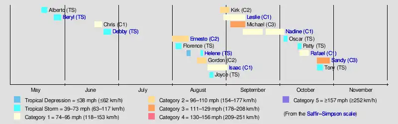 Hurricane SandyHurricane Rafael (2012)Hurricane NadineHurricane Leslie (2012)Hurricane Isaac (2012)Tropical Storm Helene (2012)Hurricane Ernesto (2012)Tropical Storm Debby (2012)Tropical Storm Beryl (2012)Saffir–Simpson scale