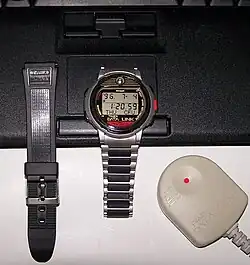 Timex Datalink or Timex Data Link is a line of early smartwatches manufactured by Timex and is considered a wristwatch computer.[1] It is the first watch capable of downloading information wirelessly from a computer.[2][3] As the name implies, datalink watches are capable of data transfer through linking with a computer.[4] The Datalink line was introduced in 1994 and it was co-developed with Microsoft as a wearable alternative to mainstream PDAs with additional attributes such as water resistance, that PDAs lacked, and easy programmability.[5] The watch was demonstrated by Bill Gates on 21 June 1994 in a presentation where he downloaded information from a computer monitor using bars of light and then showed to the audience the downloaded appointments and other data.[6] The early models included models 50, 70, 150 and model 150s (small size).[5] The model numbers indicated the approximate number of phone numbers that could be stored in the watch memory.[7] These early models were, at the time of their introduction, the only watches to bear the Microsoft logo.[8][9] The watches have been certified by NASA for space travel and have been used by astronauts and cosmonauts in space missions. There had been an evolution over the years as to the number and type of entries that can be stored in the various watch models as well as the mode of data transfer between computer and watch. At the time of its introduction the watch was considered high-tech.[10]