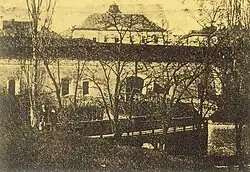 The tramway crossed the fortress moat via a wooden bridge and passed through a double-winged railway fortress gate in the city wall. Under a contract signed on 7 September 1868, the tram company was obligated to dismantle the bridge and restore the wall within 24 hours if requested by the military during a siege. For over a kilometre around the fortress, the rails ran through largely undeveloped land, resembling an interurban tramway.[3]