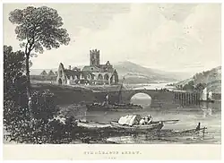 The date of foundation by the Franciscans is disputed. Documentary evidence places the foundation of the friary between 1307 and 1316, though physical evidence suggests that a preexisting 13th-century building was incorporated into the site.[8] According to the Annals of the Four Masters, the friary was founded in 1240 by the MacCarthy Reagh family.[6] This has been identified as possibly being too early.[9] Some sources ascribe this claimed foundation to Domhnall Got MacCarthy,[6] while others claim that Got MacCarthy merely expanded the friary anywhere between 1312 and 1366.[10][11] Domhnall's grandson, Domhnall Glas MacCarthy, is also thought to have been a patron of the friary.[8] Samuel Lewis, in A Topographical Dictionary of Ireland... (1837) writes that the MacCarthy's founded the friary in 1312.[12] The friary's foundation has also been attributed to the Anglo-Norman de Barry family in the early 14th century.[6] Though the friars were well established in Timoleague by 1320, the earliest surviving parts of the ruined friary date from later in the 14th century. It is likely that they were based in Timoleague Castle prior to the construction of the friary.[9]