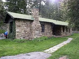 The structures are scattered on a steep landscape. The most significant building is the superintendent's residence, of rubble stone construction with a log-framed roof, covered with green shingles. The bridge is a single span built in 1935, using rubble stone. The 1935 Comfort Station restroom (presently named Last Chance restroom) is built on a ledge on the mountainside, and has a nearly flat concrete roof faced with stone. The 1928 comfort station is larger and built with a shingled roof. It is no longer used as a restroom. The rubble storage building is covered with a flat concrete roof. There are also two cold cellars on the site, both built about 1930. The trail climbs the cliffs for between one and 1.5 miles (2.4 km), its vertical climb of 1,065 feet (325 m) supported by stone retaining walls.[2]