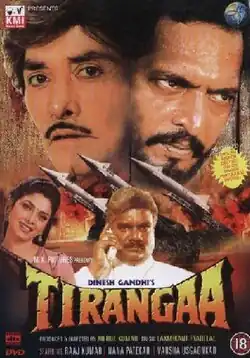 Tirangaa (transl.Tricolour) is a 1993 Indian action drama film starring Raaj Kumar, Nana Patekar, Varsha Usgaonkar, Harish Kumar and Mamta Kulkarni.[2] The movie was a blockbuster.[3] At the time of the 1993 Bombay bombings; Plaza cinema, Mumbai was also bombed where the movie was being shown, leaving 10 dead and 37 injured.[4]