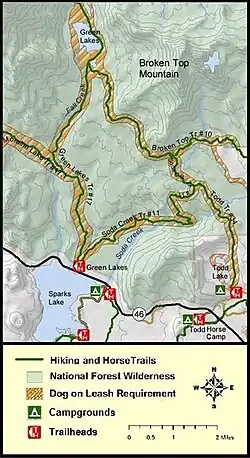 There are also a variety of trails near the lake for hiking and horseback riding. Because Todd Lake is located just outside the Three Sisters Wilderness, it is a major access point for hikers and campers heading into the wilderness. The trailhead for Todd Trail #34 is located at the south end of the lake. Todd Trail connects to Soda Creek Trail #11 from Sparks Lake. It then joins Broken Top Trail #10 running along the south side of Broken Top to Green Lakes Trail #17, which leads north to the Green Lakes at the base of the South Sister. During the summer, dogs must be kept on a leash when hiking on trails in the Three Sisters Wilderness, including all the trails mentioned above. The leash rules also apply to the Todd Lake day-use area, campground, and the trail that follows the shore around the lake.[16][17]