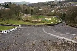 In 1969 an additional concrete spillway was built on the downstream face of the dam along a length of 75 metres (246 ft). This new weir was formed by adding concrete capping to the earth embankment to protect it from flowing water and was set above the existing spillway so that excess water would initially overflow along the original path.[2][3] In the 1980s, British Waterways carried out significant repair works to deal with leaks involving the mine shafts around the dam and a culvert was constructed under the current beach/launching area of the reservoir. A stone marker on the main beach showed its location for many years, but was relocated to the footpath opposite Toddbrook Lodge during access work for the 2009 draining.