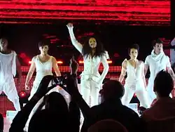 In 2004, while promoting her eighth studio album, Damita Jo, Jackson made surprise performances of "Together Again" and "All Nite (Don't Stop)" at New York's Gay Pride March.[56] "Together Again" was one of her older songs on the 2008 Rock Witchu Tour, her first tour in seven years. It was at the middle of the setlist.[57] She was dressed in a gold and black glam hip hop-inspired track suit, and one gold glove.[58] Variety magazine's Phil Gallo likened her vocals in the song to that of Diana Ross'.[59] Rap-Up noted the audience "went wild" during the song.[60] While reviewing the Vancouver concert, Marsha Lederman of The Globe and Mail noted that the most memorable moment of the show was when Jackson "stopped on the catwalk after her hit "Together Again", listened to the crowd roar its approval, and became emotional—really emotional. We're talking tears. 'Thank you,' she said—seeming to really mean it, as she waved her hands, begging the audience to stop", she completed.[58] While promoting her second greatest hits album, Number Ones, the singer performed an eight-minute medley of six hits during the American Music Awards of 2009. It included "Control", "Miss You Much", "What Have You Done for Me Lately", "If", "Make Me", and finished with "Together Again". For the latter's performance, Jackson stood alone at center stage, smiling, as the received applauses and standing ovation from the audience.[61][62] It also was the closing song of her concert at Essence Music Festival in New Orleans, in July 2010, which she headlined.[63] "Together Again" was again performed as a closing number on her Number Ones: Up Close and Personal 2011 tour as a dedication to her late brother, Michael Jackson, wearing a tight white one-piece disco suit. MTV News' writer Vaughn Schoonmaker noted that the song appeared to be the biggest hit of the show.[64] Writing for the Hartford Courant, Thomas Kintner pointed out that "A finale of 'Together Again', offered as a simple tribute that recalled her brother again, proved the evening's highlight, a relaxed trip through the sort of juicy pop Jackson has stockpiled throughout her career, and which still charms when she lets it run".[65] Jackson also included the song on her 2015–16 Unbreakable World Tour. The song is also included on the 2017-2019 State of the World Tour. Jackson also included the song on her 2019 Las Vegas residency Janet Jackson: Metamorphosis. Jackson later named her 2023 tour after the song, and performed it in multiple versions throughout the show: The DJ Premier 100 in a 50 remix at the beginning of the show, the Deeper remix at the middle, and, as the encore, the album version.[66]