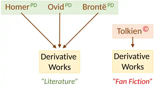 A different boundary is copyright, with enormous numbers of published stories from fan authors who have become able to communicate with a large audience.[30] Smol describes fan writing in the Western world as "on the fringes of copyright law", noting that Tolkien fan authors know they cannot sell their work, but publish using pseudonyms and copyright disclaimers.[13] Booker describes fan fiction on the Web as an "outlaw practice", since "most fan fiction sites do actually violate strict copyright interpretations, despite posted disclaimers."[4]
