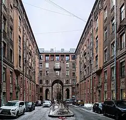 Decorating facades of the backyard in the same manner as the front ones was uncommon for Petersburg. Three interconnected yards that create an inner street are colloquially called the Street of Lidval.[8] Prominent Russian art historian Boris Kirikov finds the Renaissance arches the most decorative part of the design. Made of limestone blocks, they are framed with pilasters and obelisks. Because of the irregular shape of the land, the inner street is angular and the yards open one after another, creating an unusual perspective effect. Lidval repeated this design in construction of the Nobel House on Lesnoy avenue, 20. According to his idea, the inner yards were to create the spirit of good-neighbourliness with a semi-private zone where the dwellers and the passers-by wouldn't be isolated from each other.[9][6][10]