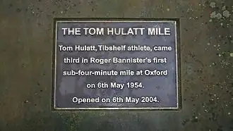 Hulatt suffered an Achilles tendon injury in 1960, and in his later years he did some coaching, but only ran at the annual Tibshelf Horticultural Show. He died aged 59 and was buried in the grounds of St. John the Baptist Church, Tibshelf. On the fiftieth anniversary of his run, a one mile stretch of the Five Pits Trail was designed as the 'Tom Hulatt Mile'[1] identified by two marker stones, with inscribed plaques, in coal measures sandstone donated by the National Trust.[3][4][5]