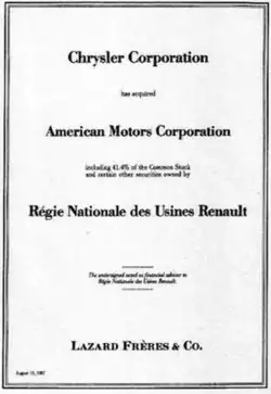- ^ Holusha, John (10 March 1987). "Chrysler is buying American Motors; cost is $1.5 billion". The New York Times. Retrieved 2 January 2016.