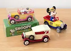 In the early years, Tomy produced cars with famous characters sitting on them, using the same castings from the regular Tomica line. The first of such was the Snoopy character cars from the 1970s. Tomy did not market and distribute these cars. Rather, they produced these for Aviva, who sold the toy under the Aviva brand name. In the early 1980s Tomy produced models with Muppet characters. Also in the 1980s, Tomy started producing vehicles with Disney characters under the Putica Disney series name. This popular series was made until the late 1990s and was also re-issued in the original style boxes sometime during the 2000s.