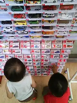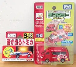 Tomica (トミカ, Tomika) is a line of die-cast toy vehicles (mainly cars) produced since 1970 by Takara Tomy Co. of Japan (formerly known as Tomiyama and Tomy Kogyo Incorporated).[1] Ostensibly, Tomica diecast were an outgrowth of Tomica World, an autonomous toy line of motorized train accessories that Tomy had created based on Plarail and produced since 1959.[2] Similar in concept, Tomica can be thought of as the "Japanese Matchbox", but focuses mainly on Japanese brands.