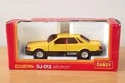 Dandys were diecast metal and most also had metal bases. Wheels looked authentic, but were hard black plastic and not rubber, which was normal for 1:43 diecast cars in the 1980s. Some Dandy cars had special features like the Mazda Savanna with "pop-up" headlights operated from a lever inside the car.[6] Packaging colors varied and some were promotional models, but commonly, boxes were blue or red showing a perforated license plate shape with 'Dandy' written on the plate. Tomica Dandy castings have also been used in gift sets and the Limited S Series, but these models have the "Dandy" name on their base plates removed.