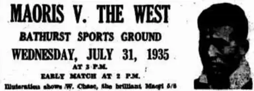 The New Zealand Māori side then travelled to New South Wales for their game against Central West NSW in Dubbo on July 24. Chase was initially named to play on the wing but came out on to the field at five eighth.[228][229] The Maori side won 38-3 before 2,000 spectators with Chase scoring one of their ten tries.[230] With the score 16-3 near halftime Chase “broke away, but slipped over”. In the first half a try was scored following “splendid combination between Chase, the outside five-eighth, Nēpia… and Harrison, … [with] a pretty exchange of passes resulting in Harrison scoring”. Chase was later involved in a movement with Hemi which saw Ngaia score. He was involved with Mellish and Len Kawe in a “brilliant movement” which saw Kawe tackled “inched from the line”. Following a break by Harrison he sent the ball “along to Chase, who ran over between the posts to score”.[231] Soon after Nepia “dashed away and sent to Chase, the little five eighth going to the 25 before being toppled”. Midway through the second half the Māori side made a dribbling rush and Chase collected the ball and “streaked over, only to lose the ball”. Then later he “wound his way through the opposition and was careering for the scoring area when Ryan downed him with a splendid tackle”.[232] It was commented that Chase “is quick off the mark, and shone in attack”.[233] And “was an effective pivot for attack as five eighth”.