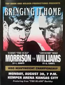 On June 7, 1993, Tommy Morrison defeated George Foreman by unanimous decision to capture the vacant WBO heavyweight title.[2] For his first title defense, Morrison was matched up against Mike Williams, whom had co-starred with Morrison in Rocky V. In the film, Morrison's character Tommy Gunn defeated Williams character Union Cane to capture the heavyweight championship. Though Williams sported a fairly impressive 21–3 record, he was not regarded as top heavyweight contender as most of his wins had come against marginal competition, aside from a sole notable knockout win over former title challenger James Tillis, and his three losses had come when he stepped up in class. Nevertheless, Morrison and Williams' appearance in Rocky V added some luster and intrigue to the fight and sports giant ESPN decided to broadcast the bout nationally and powerful boxing promoter Bob Arum's Top Rank handled promotional duties.[3] Morrison was taking a risk, as he had already agreed in principle to an $8,000,000 deal to face WBC heavyweight champion Lennox Lewis. Williams' manager Bob Jordan criticized Morrison's decision to fight despite having secured a lucrative title shot stating "I think Tommy's people made a terrible mistake. He has a tremendous amount to lose if we win this fight. We have nothing to lose and everything to gain."[4]