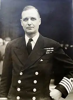 In mid-July 1943, after four years almost continuously at sea, Pugsley was recalled to join the Combined Operations planning for D-Day at Cowes under Commodore John Hughes-Hallett. Pugsley was appointed to command one of the assault groups.[2] Each landing force (there were originally three, two British and one American, although this was later increased to three British and two American) had a commodore or rear-admiral as naval commander and was subdivided into three assault groups each with a captain in command. Pugsley was given the frigate HMS Lawford as his headquarters ship for assault group J1, responsible for the landing operations of the 3rd Canadian Division at Juno Beach.[16] Lawford was sunk by enemy aircraft in the early stages of the landings.[17] The landings completed, Pugsley was awarded a second Bar to his DSO.[18] and was appointed deputy to Admiral Vian in the British landing areas in the Channel as Captain (Patrols).[19]