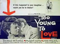 Too Young to Love is a 1960 British drama film set in New York. It was directed by Muriel Box and starring Pauline Hahn, Joan Miller, and Austin Willis.[1][2] It was based on the play Pickup Girl by Elsa Shelley.[3] An adaptation of the story was broadcast on British TV on 6 December 1957 in the ITV Television Playhouse series.