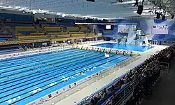 The centre has three pools: the dive pool (25m), the competition pool (50m) and the training pool (50m). The competition pool has 3,500 seats.[3] The facility doubles the number of Olympic pools in Toronto. The dive pool has three diving platform heights (3, 7.5 and 10 metres) and a dry diving training centre.[3] The centre is the only aquatics facility in the area that meets international competition standards and the first facility with a warm-up pool. The competition pool is regarded as one of the fastest pools in the world.[3] Public lane swim and leisure swim typically takes place in the training pool, while team practice and competition takes place in the competition pool. Ticket prices for lane swim are the same as other City pools.