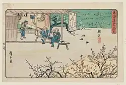 Featured on the ukiyo-e prints by artist Hiroshige, The Fifty-three Stations of the Tōkaidō, one print features Mariko-juku, the 20th station of the Tōkaidō, of a teahouse serving tororo-jiru.[19][20]